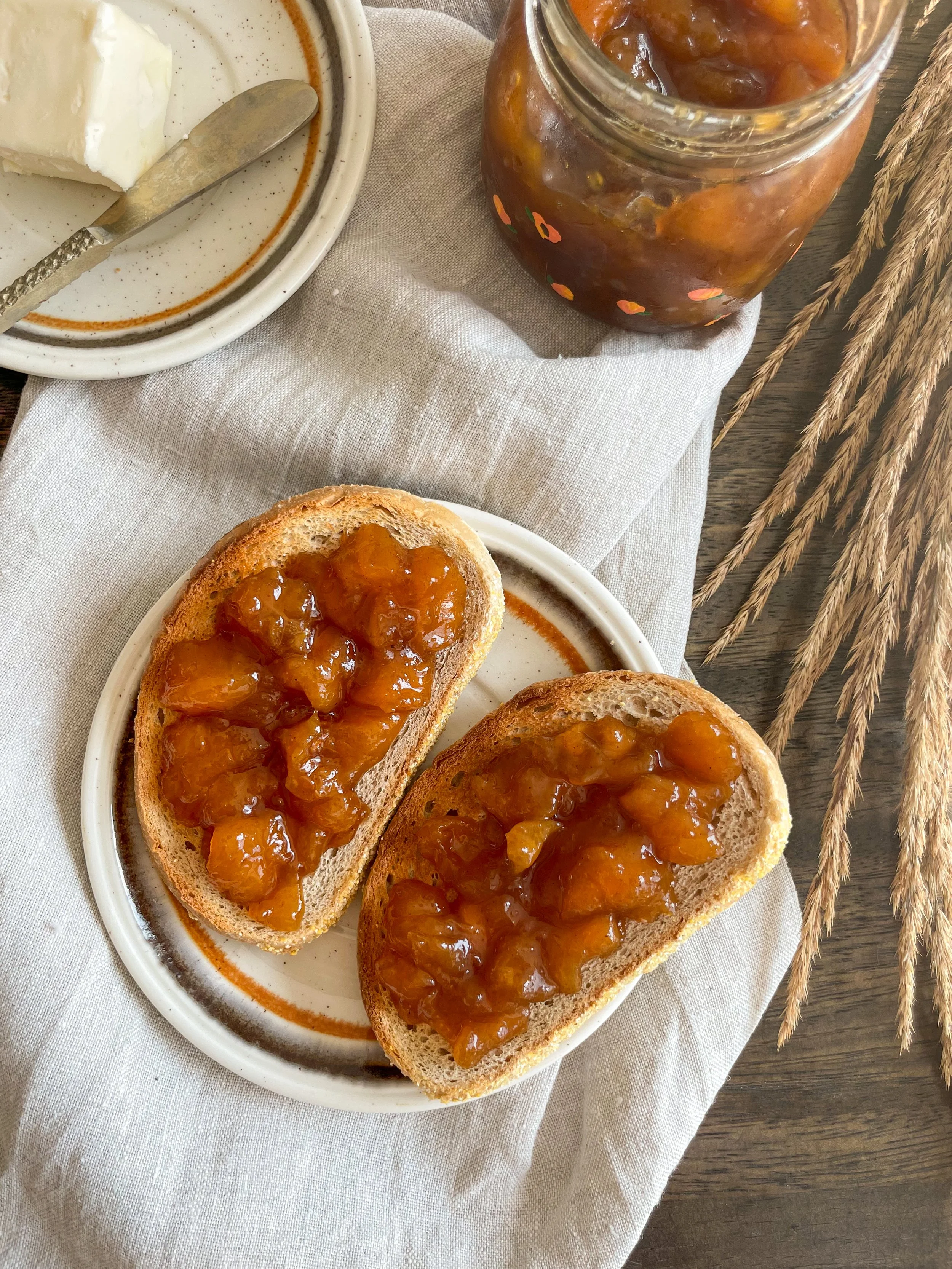 C’est toujours le temps des nectarines et des pêches et l’automne approche… combine les deux saisons en une seule confiture! À déguster sur un bon pain et du beurre végétal.