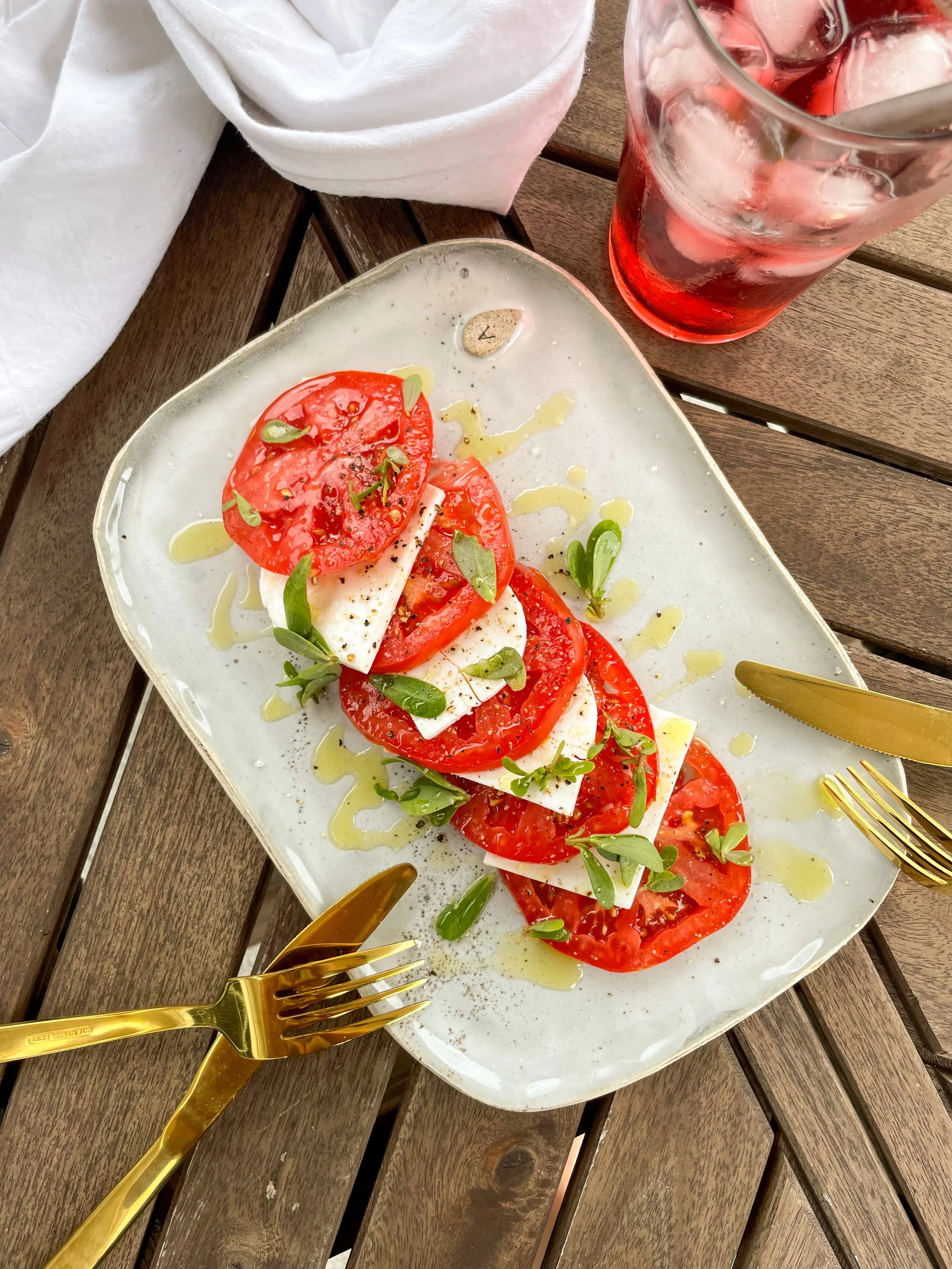 Une entrée qui cris l’été avec des belles tomates du Québec sucrées, de la mozzarella végane, une huile de qualité, de la fleur de sel ainsi que du pourpier, une plante comestible que l’on classe de mauvaise herbe et qui est très présente dans notre jardin.